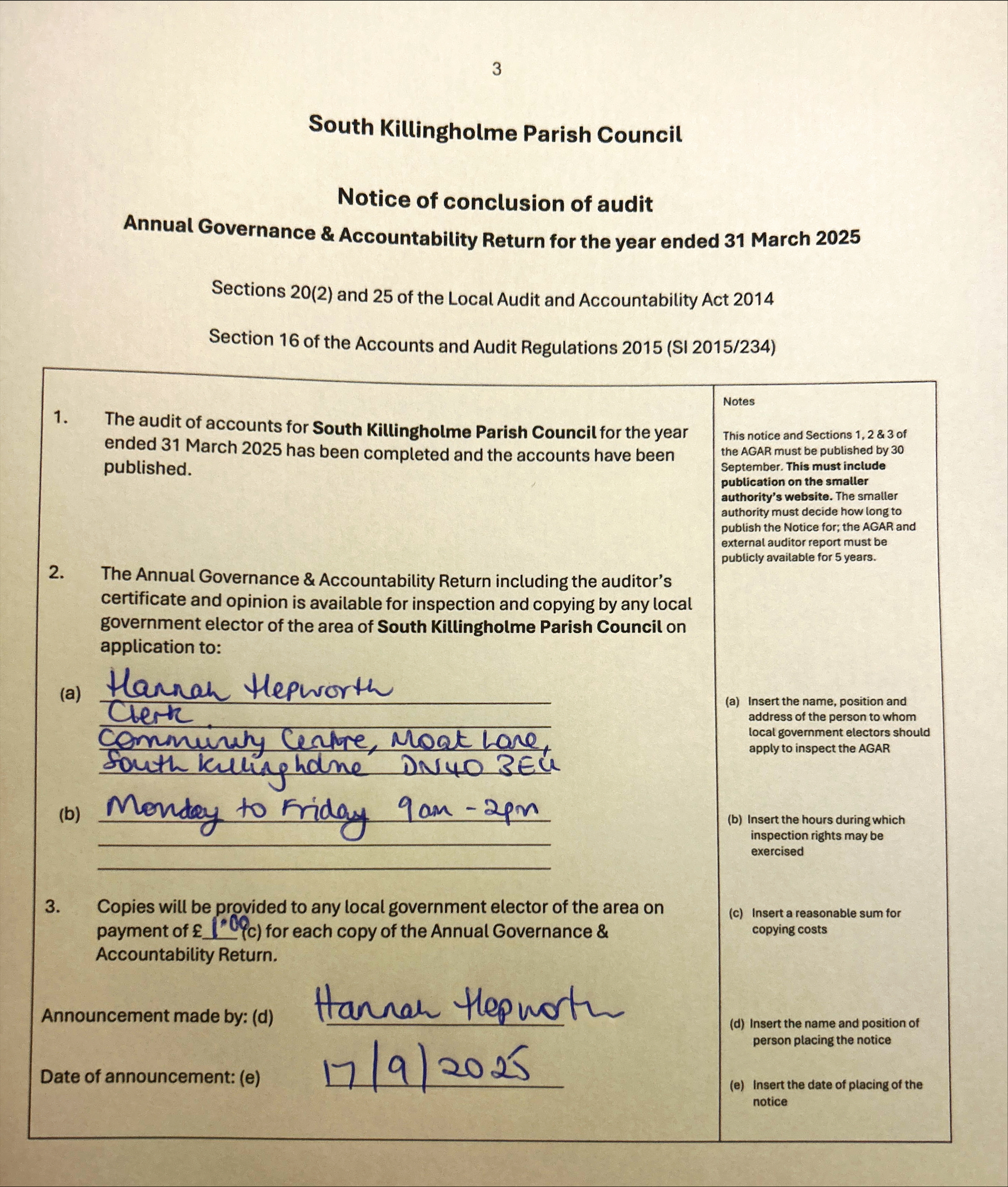 Financial books have already been displayed on 10th June 2019 and will be open for inspection at the next council meeting Monday 1st July. Alternative times can be arranged for inspection at the community centre at the request of the Clerk.